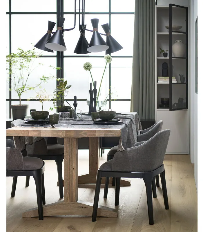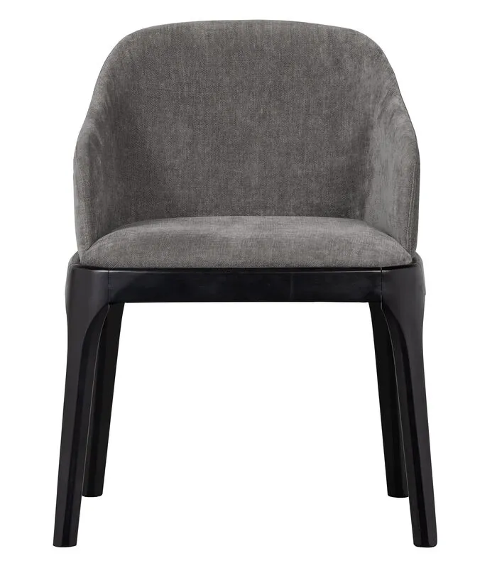 De Scroll eetkamerstoel is een lust voor het oog met zijn stoere, robuuste design. De eetkamerstoel van het Nederlandse interieurmerk vtwonen heeft een houten frame met opvallende rand rondom de zitting. Het hout is afgelakt in een zwarte kleur. De zitting is comfortabel en bekleed met een warm grijze, geweven stof. Zeer gemakkelijk in het onderhoud en kindvriendelijk.