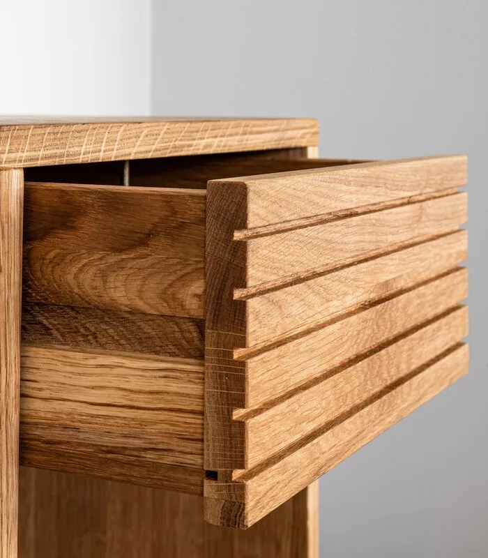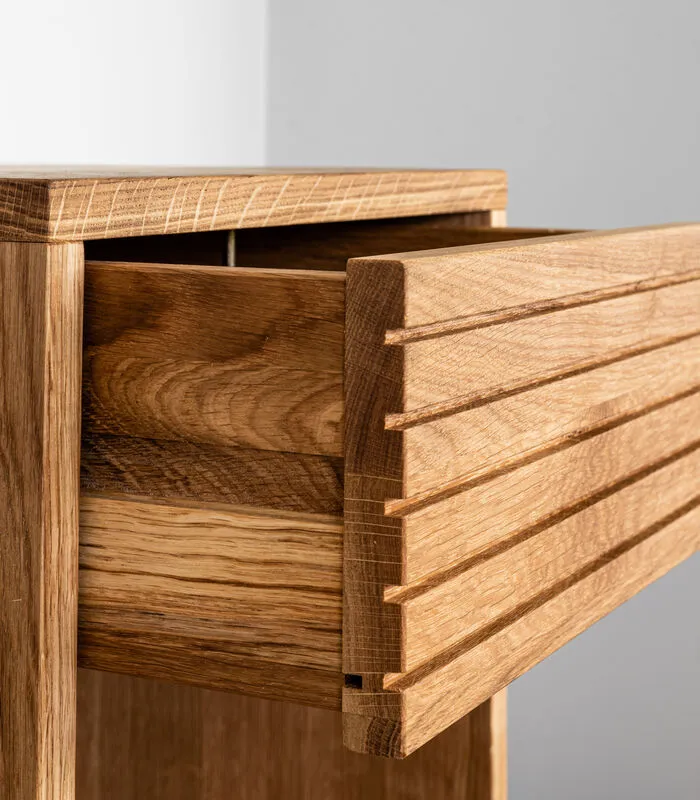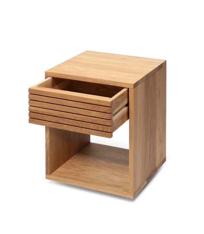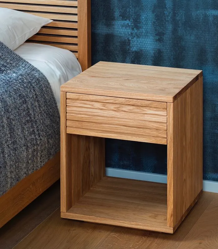 Het nachtkastje, dat de natuurlijke schoonheid van Europees eikenhout benadrukt, combineert de Scandinavische stijl met moderne superieure kwaliteit. Ontworpen met een enkele lade en een onderste plank, heeft dit meubel een houtstrook effect detaillering op het voorpaneel wat een verfijnd stijlaccent geeft. Dit product is gemaakt van natuurlijk massief eikenhout, elk stuk is uniek qua kleur, natuurlijke kenmerken, nerfpatronen en afwerking. Het is dus mogelijk dat u enkele verschillen tussen artikelen van eenzelfde productlijn ziet; dit is onderdeel van de natuurlijke schoonheid van onze producten.