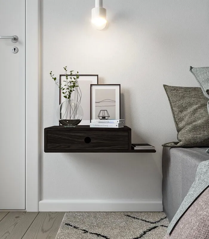 Een modern zwevend nachtkastje met een lade en een extra plank aan de rechterkant is een geweldige oplossing voor de meeste slaapkamers. Functionele lade om uw spullen op te bergen en binnen handbereik te houden en een plank om uw favoriete boeken op te leggen en extra opbergruimte te hebben. Dit product is gemaakt van massief Europees berkenhout met de schoonheid van de natuurlijke nerf van het hout.