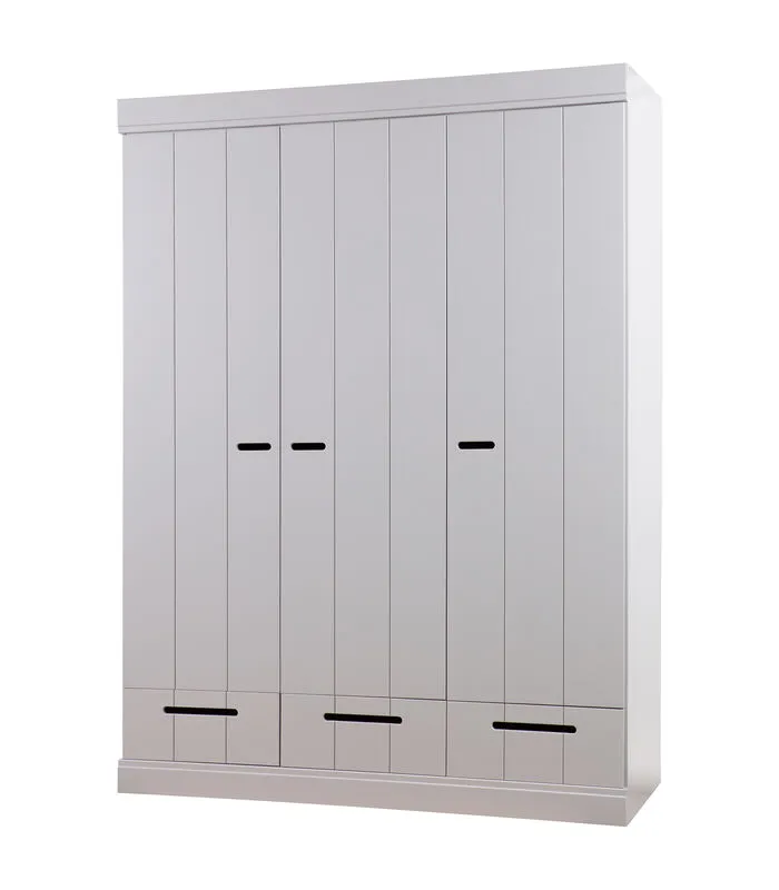 De serie CONNECT bestaat uit een ladekast en 3 basiskasten: Een 2–deurs kast, een 2–deurs kast met lades en een 3–deurs kast met lades. De kasten zijn zo gemaakt dat ze vlak tegen elkaar aan kunnen worden geplaatst. De kasten kunnen perfect naast elkaar geplaatst worden en zo kun je de kast zo breed maken als je zelf wilt. De 2–deurs en 3–deurs kasten zijn verkrijgbaar met twee typen deuren: een strokendeur met sleuven als handgreep of de stoere lockerdeur met wit metalen grepen. De CONNECT 3–drs kasten beschikken over een breed hang–/leg interieur (1 roede + 1 legplank) en achter de rechter deur 3 gedeelde legplanken. Indien je meer legplanken wenst dan kun je deze kast ook voorzien van een extra interieurpakket. In het hanggedeelte komt dan een extra tussenschot met 2 extra legplanken.