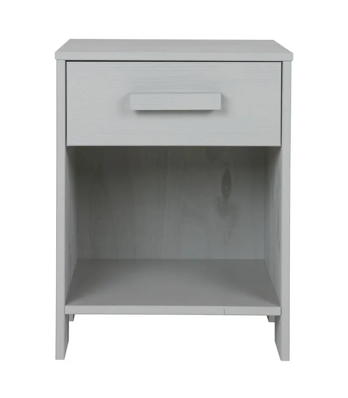 Geborsteld grenen nachtkastje met lade. Het nachtkastje is gemaakt van grenen en is gespoten in een de stoere kleur betongrijs. Dit nachtkastje is onderdeel van de kamer Dennis, deze kamer bestaat uit een bedbank of een bed zonder wanden, een buro, een kast, een opbergkist, een nachtkastje en een wandplank. GEBORSTELD HOUT Dit meubel is gemaakt van geborsteld hout. De nerven en noesten worden door het borstelen geaccentueerd waardoor het hout een doorleefde uitstraling krijgt. Door deze bewerking kunnen oneffenheden, kleine scheurtjes en noesten extra zichtbaar zijn. Dit zijn kenmerken van het doorleefde hout. Ieder exemplaar is hierdoor uniek! Dit nachtkastje wordt geleverd als eenvoudig bouwpakket met een duidelijke montage–instructie.