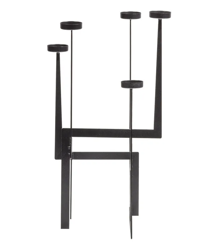 De kandelaar biedt ruimte voor vijf waxinelichtjes van ø 5 cm, diepte 1,5 cm. Het metalen frame Heeft onderaan een breedte van 2,5 cm maar loopt taps toe naar de waxinelichthouders tot een breedte van 1 cm. De kandelaar vindt zijn balans op twee smalle poten (H20/24 x B2,5 x D0,5 cm) en één lange kant van 22 cm breed.