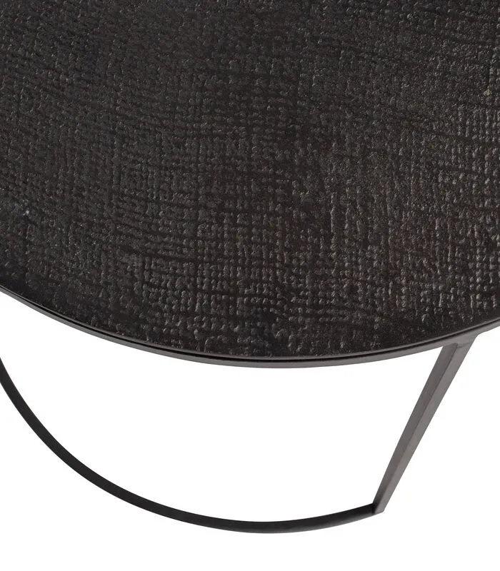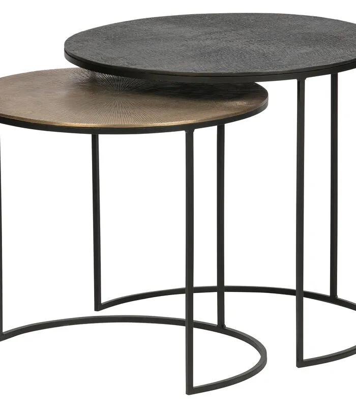 Chique en modern, dat is deze set van 2 Fara bijzettafels uit de collectie van het Nederlandse merk WOOOD Exclusive. De bijzettafels hebben beide een aluminium blad, één met een antique brass afwerking en een streepjes patroon in het blad en de andere met een zwarte afwerking en een soort deukjes patroon in het blad. De onderstellen zijn gemaakt van ijzer met een zwarte afwerking.