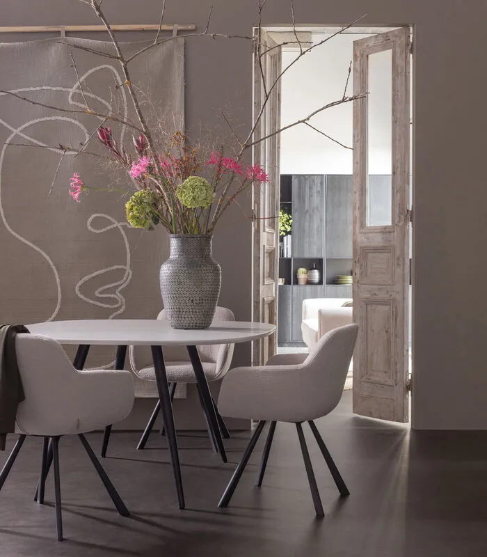 De Juno eetkamerstoel heeft metalen poten met een matzwarte poedercoating. De zitting is gevormd uit een stalen frame en multiplex, bedekt met een polyurethaan schuim. De zitting is bekleed met een wollige bouclé. Deze zachte bouclé heeft een elegante textuur die meteen warmte in huis brengt. De dichte weeftechniek zorgt voor de sterkte van de stof, dit maakt dat de bouclé niet snel zal slijten of scheuren. Ook heeft elke kleur een hoge kleurvastheid, maar het is aangeraden om direct zonlicht te vermijden om kleurnuances te voorkomen.