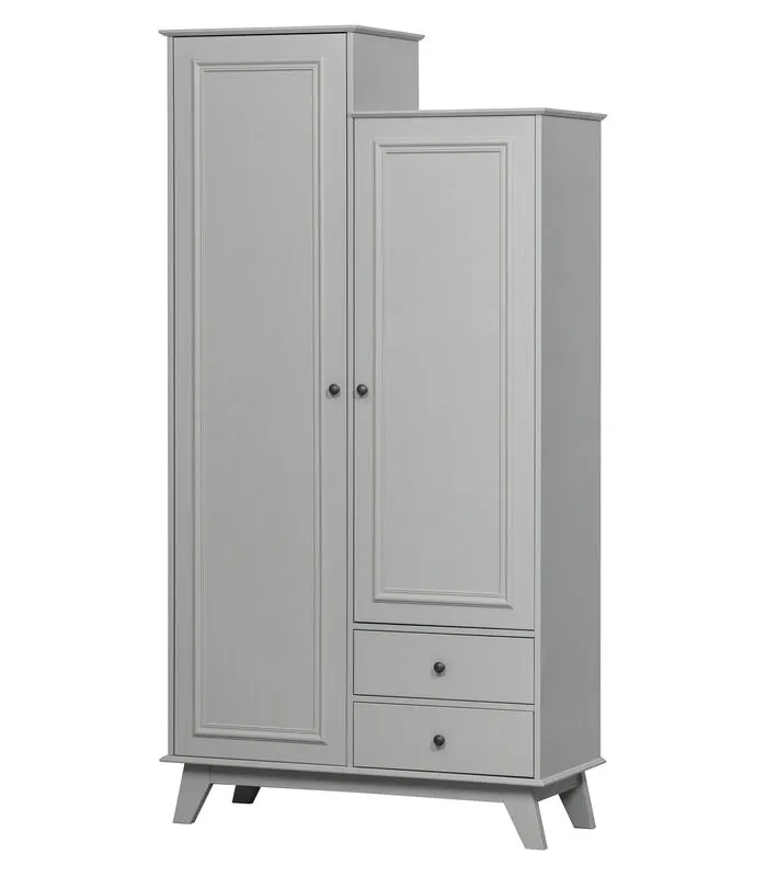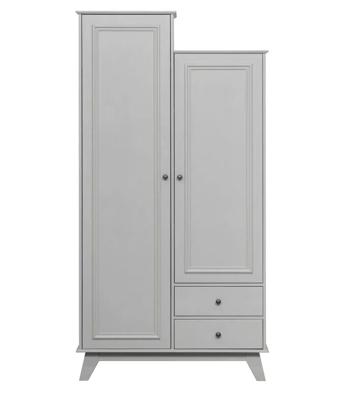 Deze Lily garderobekast is door zijn asymmeterische ontwerp speels, maar met een klassiek uiterlijk. Lily is een eigen ontwerp en komt uit de collectie van het merk WOOOD. De garderobekast is gemaakt van grenen dat is afgewerkt in een warm grijze kleur. De kast is voorzien van twee lades voorzien van een zwart metalen knop greep en twee deuren voorzien van een zwart metalen knop greep. Vanwege de asymmetrische hoogte van de kast geeft Lily een speels effect, maar door de klassieke uitstraling is het een tijdloze kast.
