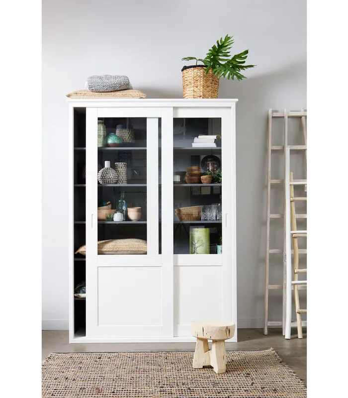 Kersvers model schuifdeur–vitrinekast van WOOOD. Een rustig en strak uiterlijk en bovenal ruimtebesparend dankzij de prettige schuifdeuren. De kast is gemaakt van grenenhout en heeft aan de buitenkant de kleur wit en het interieur heeft de prachtige kleur leem. Deze kast wordt geleverd als eenvoudig bouwpakket, met een duidelijke montageinstructie.
